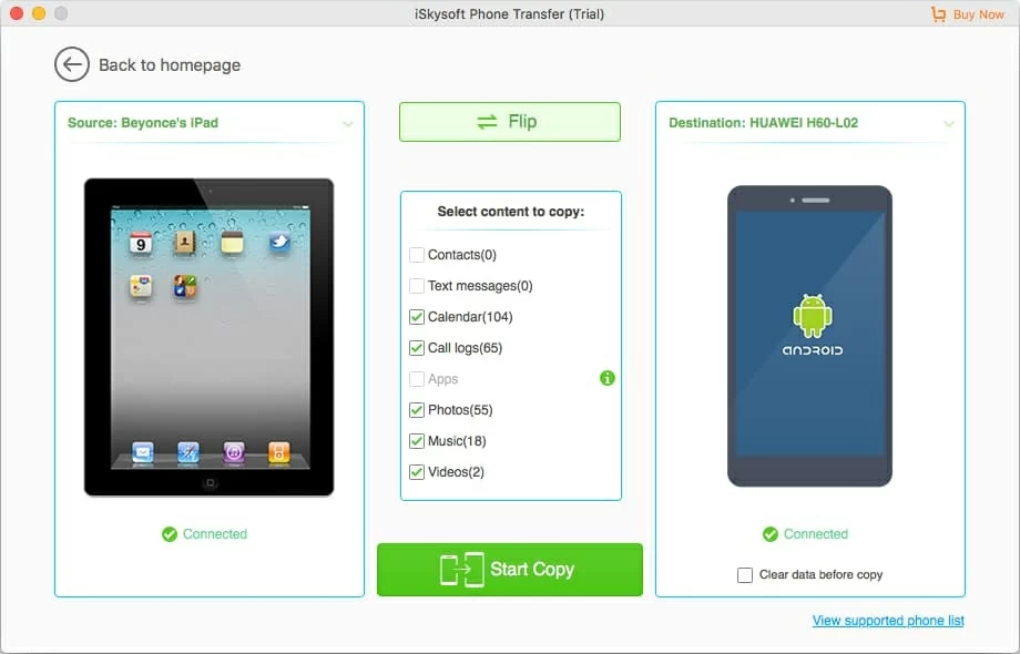 虽然有多种程序和方法声称可以将歌曲从 iPad 传输到 Android 设备(包括 HTC 智能手机),但我们将坚持使用 Phone Transfer,因为它在数据迁移、简单性和效率方面具有天赋。它使您能够迁移 iPad 或 iPhone 上的几乎所有数据,并以简单的方式转移到 Android 设备。此外,您可以复制重要文件并将其保存在计算机上,以便您可以方便地将备份恢复到您的设备。