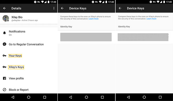 – 找出正在与您进行秘密对话的联系人。然后点击信息图标,您将看到两个钥匙 - 您的钥匙和接收者的钥匙。