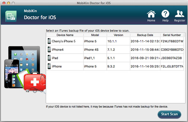 步骤1。首先在 Mac 上下载并安装该软件。启动它,它将扫描您的 Mac 以查找此计算机上保存的所有 iTunes 备份记录。选择您需要的 iTunes 备份文件,然后单击“开始扫描”。