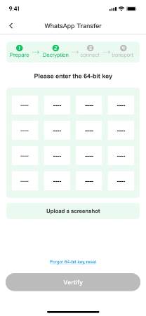 备份完成后,在下一个“请输入 64 位密钥”屏幕上输入密钥,然后点击“验证”。验证后,选择所需的“传输方式”并通过电缆或 Wi-Fi 将 Android 设备与 iPhone 设备连接。