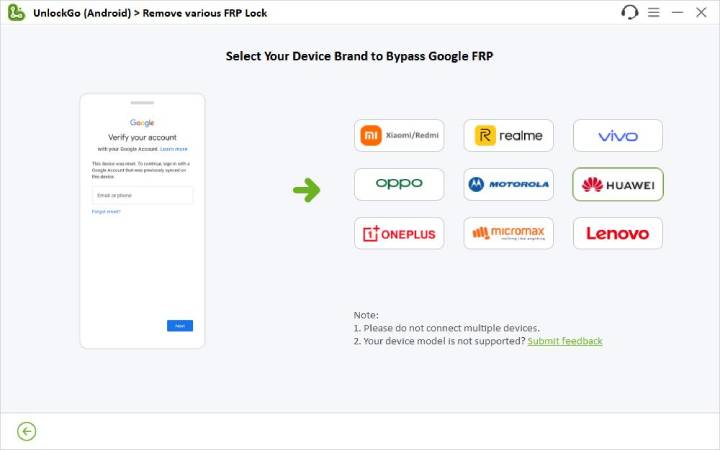 步骤2如您所见,UnlockGo Android 可以绕过许多 Android 品牌的 Google FRP 锁。在这里,请选择您的品牌华为。