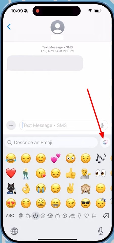 步骤1前往 iOS 18 上所需的消息应用程序 (iMessage),然后点击“短信”框以显示键盘。从这里,选择“表情符号”图标,然后按“描述表情符号”搜索栏旁边的“Genmoji”图标。