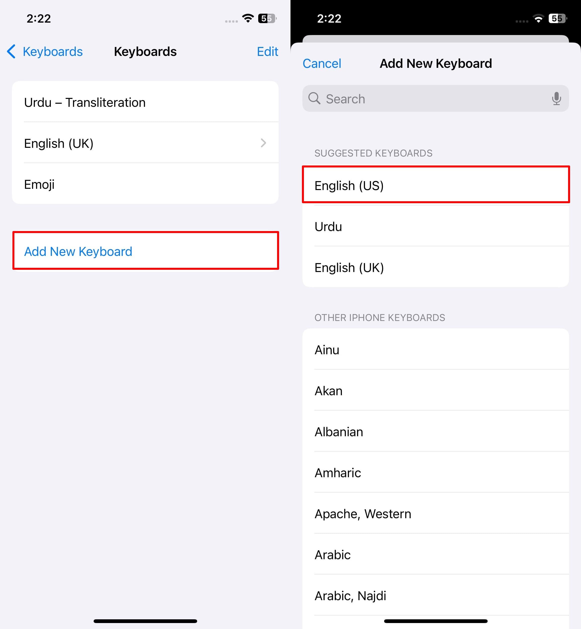 步骤2从这里开始,如果您在键盘设置上没有看到英语(美国)和表情符号,请按“添加新键盘”选项添加这两个键盘。