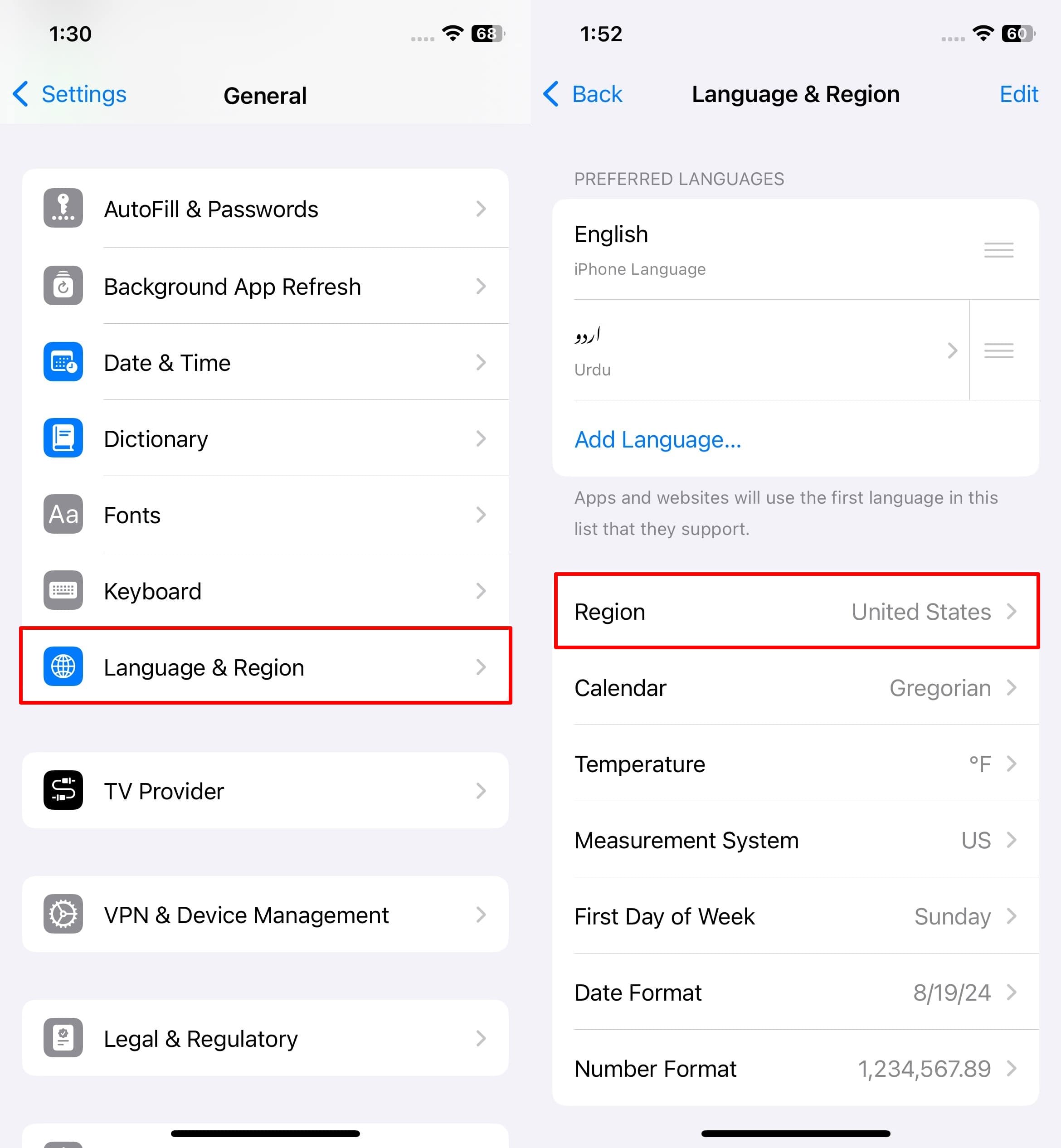 指示:从“常规”设置中,点击“语言和区域”选项,然后在新屏幕中按“区域”将“美国”添加为您的区域。
