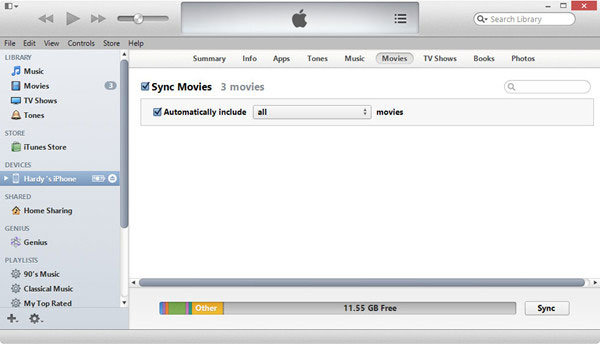 - 添加视频后,您可以进入iTunes面板中的“电影”选项卡。打开同步电影选项。