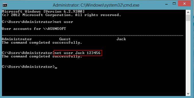 - 在CMD窗口中,键入“ Net用户管理员123456”并命中Enter,并且将用此新密码'123456'替换旧密码。