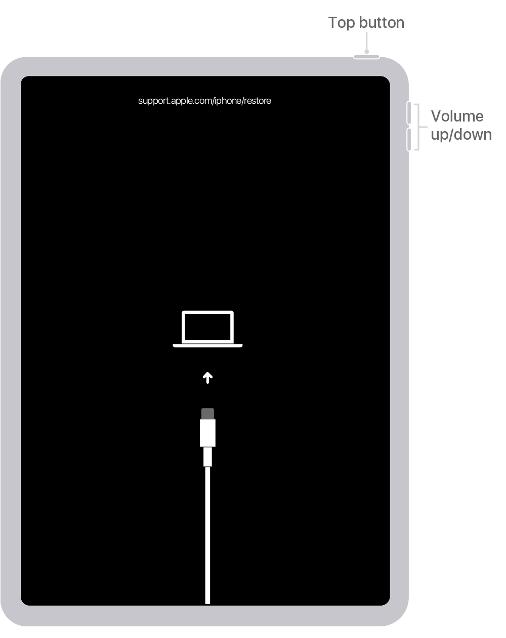 - 没有主页按钮的 iPad:按音量增大按钮,然后按音量减小按钮。按住顶部按钮直到出现恢复屏幕。