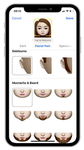 在面部毛发类别中,您可以在iOS 12 Memoji或Avatar中添加长或短侧角。同时,如果愿意,您可以加胡须和胡须。之后,还可以选择或添加不同的胡须颜色,甚至可以添加高光。