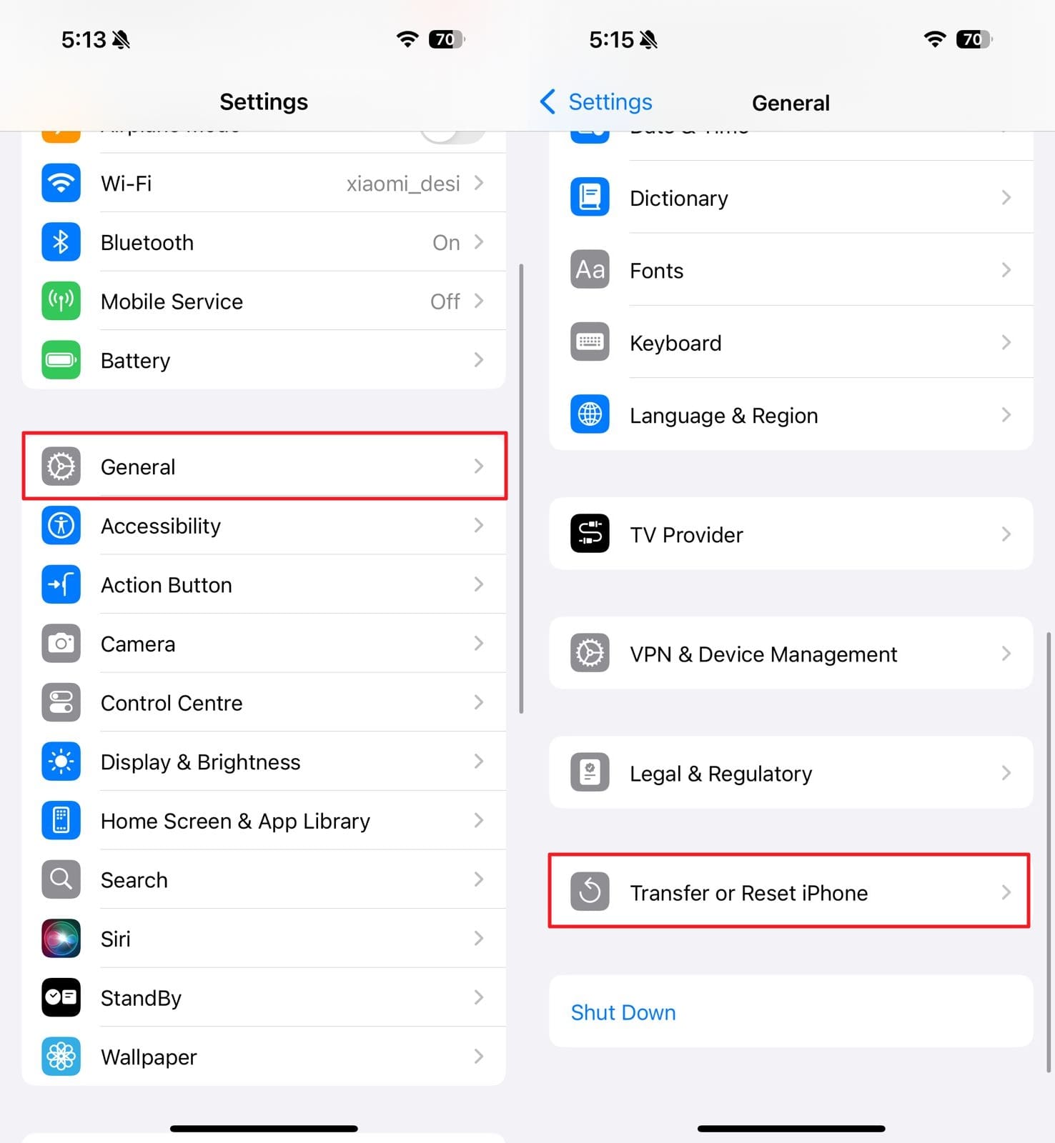 步骤1通过访问“设置”应用程序并点击“常规”部分来开始此任务。当您看到新的显示时,向上滑动以选择“传输或重置 iPhone”选项。