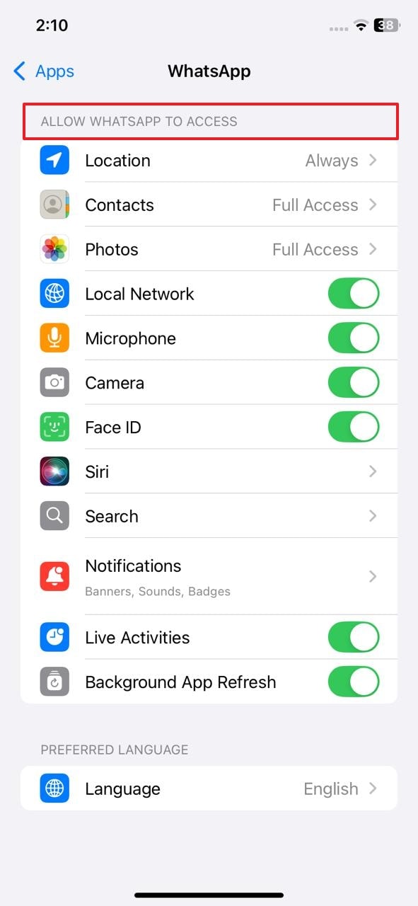 指示:首先,访问 iOS 设备上的“设置”,然后向下滚动以选择“应用程序”选项。然后,点击下一个屏幕上的“WhatsApp”,并从“允许 WhatsApp 访问”部分切换权限。