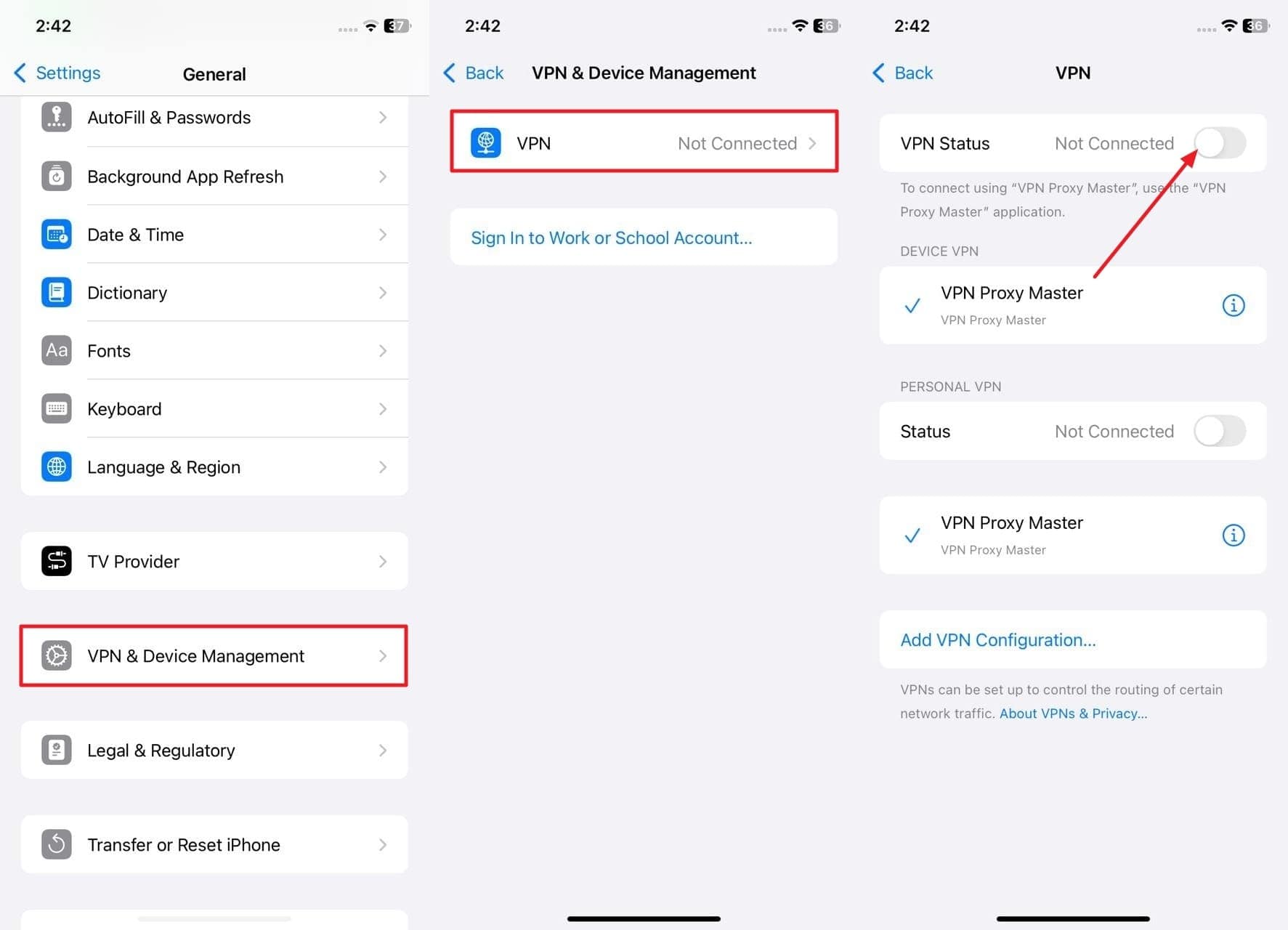 指示:要启动,请打开“设置”并转到“常规”部分。之后,向上滑动并选择“VPN 和设备管理”选项。接下来,点击“VPN”选项,然后关闭“VPN 状态”以将其关闭。