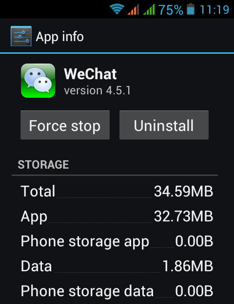 – 现在您将处于应用程序信息微信页面。在这里您可以点击卸载将其从设备中删除。这里你需要点击卸载再次确认您的选择。