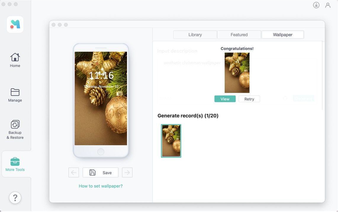 想要用独特的圣诞壁纸来个性化您的 iPhone?想象一下:UltFone iOS 数据管理器是一款用户友好的工具,利用先进的人工智能技术。只需输入您想要的描述,然后见证人工智能的魔力,它会根据您的喜好制作定制的圣诞壁纸。