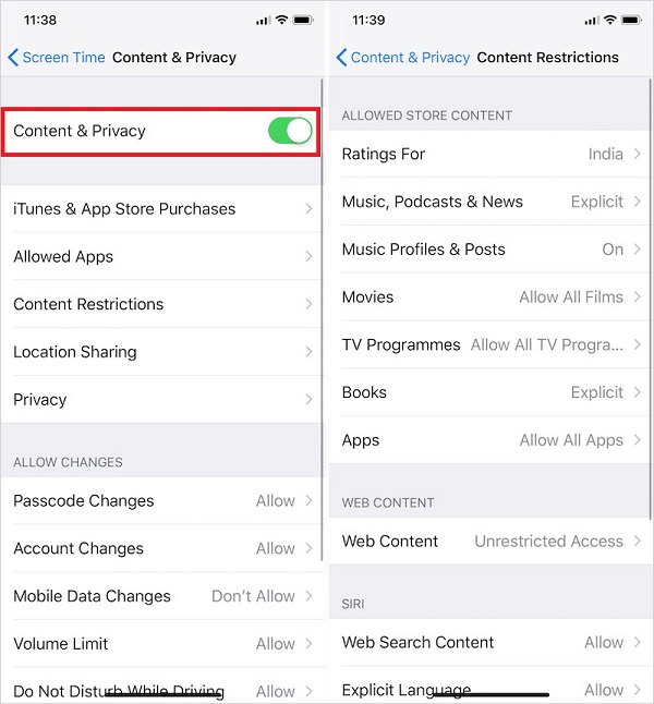 通过启用内容和隐私限制,您可以更改设备上的某些设置。例如,您可以限制 iTunes 和 App Store 购买,禁止特定内容、应用程序、露骨语言等。打开该功能的方法如下: