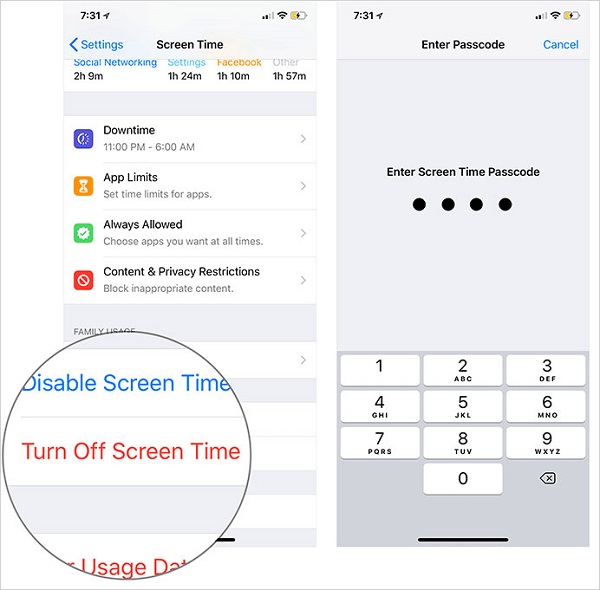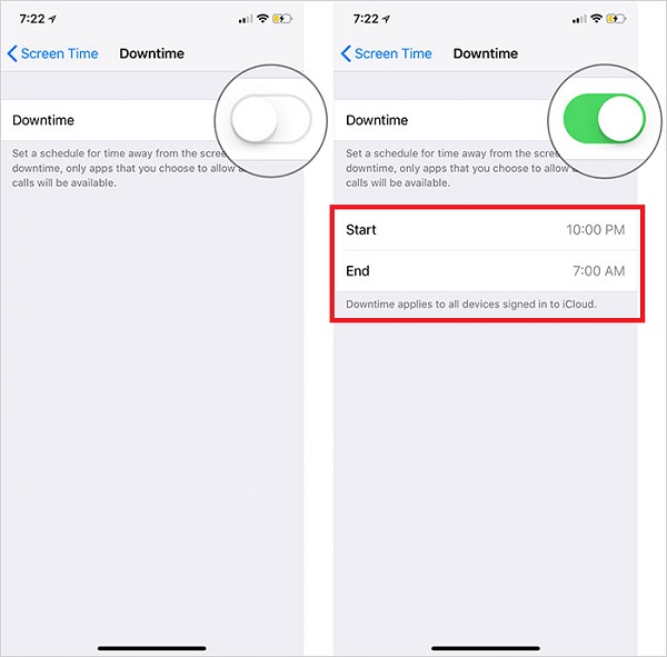 – 输入您的 S屏幕时间密码如果需要,请滑动旁边的按钮停机时间将其打开。