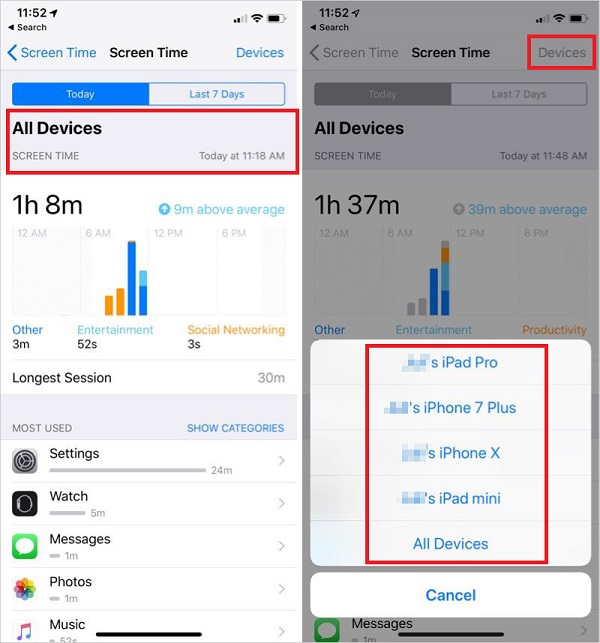– 在“屏幕时间”页面上,点击所有设备然后选择设备从右上角。