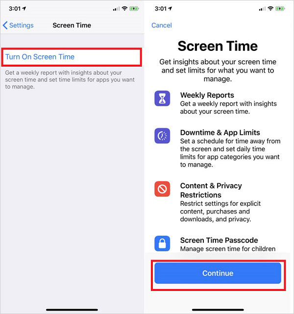 – 之后,您将有两个选择:将此功能设置为父功能和继续以普通用户身份。只需点击第一个选项,然后按照提示自定义停机时间、应用程序限制、内容和隐私并设置您的家长密码。