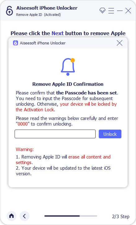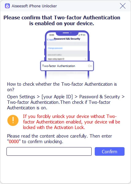 完成后,仔细阅读警告,然后在文本框中输入“0000”,然后输入开锁按钮。
