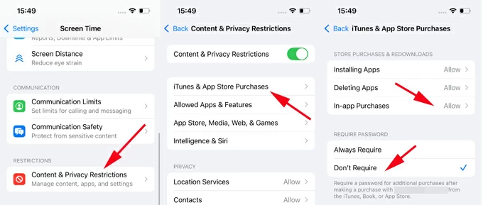 - 禁用 App Store 购买时无需密码的屏幕时间限制。