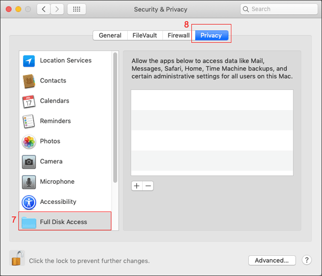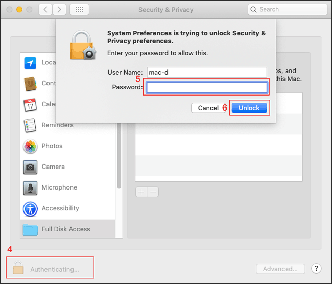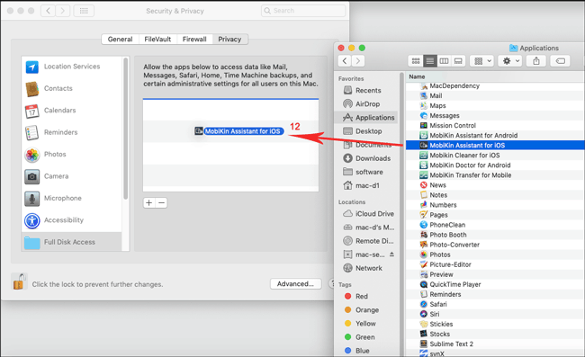 步骤 6。将程序图标从应用领域窗口到全磁盘访问 – 隐私窗户。完成后,程序图标可能会变为解锁、修复或擦除图标,这取决于您第一次安装的程序。请让这个更改滑动,现在授权已完成。