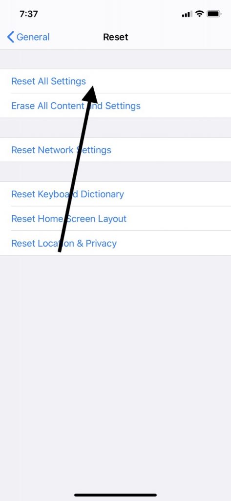 前往设置, 然后一般的。向下滚动并点击重置,然后点击重置所有设置。这将需要一些时间,完成后,您可以按照所有步骤设置手机,就像您第一次拿到手机时一样。您必须重新设置 Face ID,还必须通过 iTunes 或 iCloud(无论您喜欢哪种)检索手机的备份。