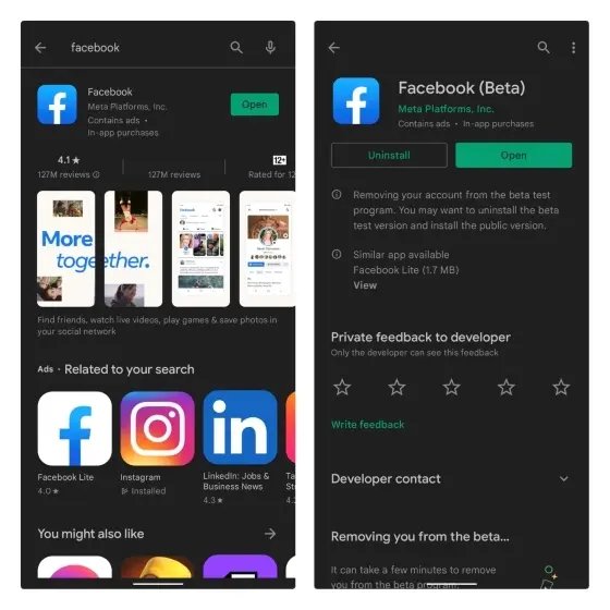 如果所有步骤都对您没有帮助,您可以尝试更新 Facebook 应用程序,以防新的更新导致您从帐户中退出。打开 Play Store 和 App Store 上的 Facebook 应用程序列表并更新该应用程序。如果更新未能解决问题,您还可以尝试卸载 Facebook 并重新安装。