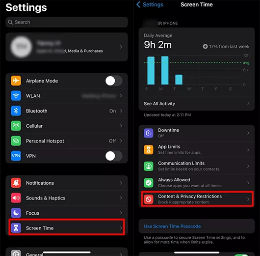 - 接下来,点击内容和隐私限制继续。