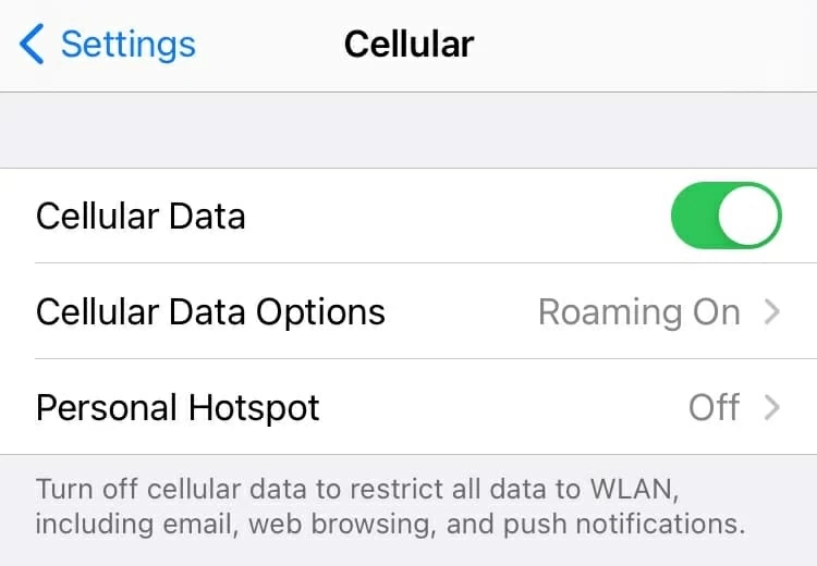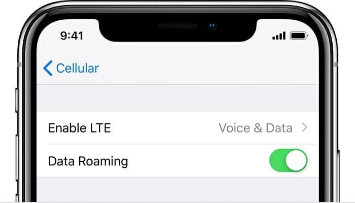 您可以在 iPhone 设置应用程序的“蜂窝网络”选项卡中打开此功能:设置 > 蜂窝网络 > 蜂窝数据选项 > 数据漫游。打开开关。