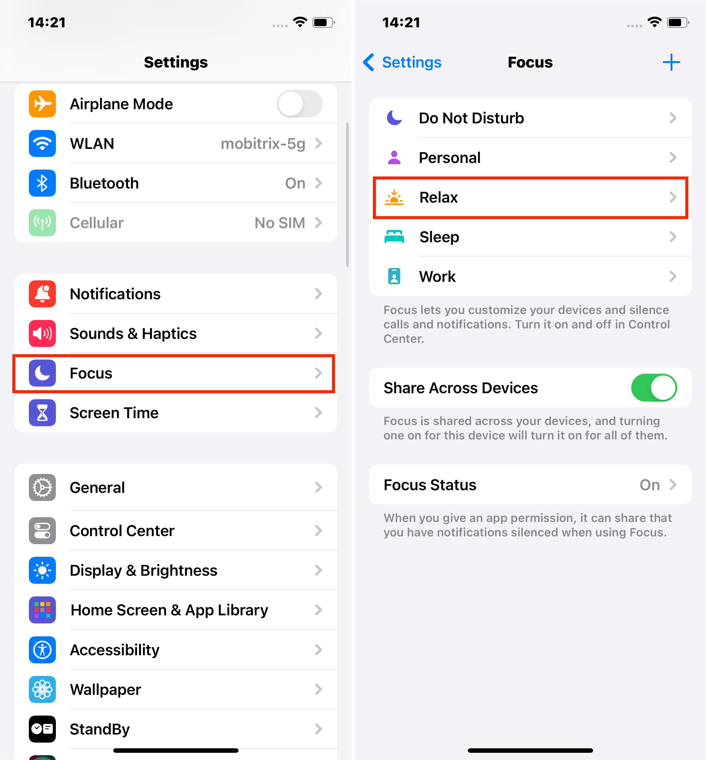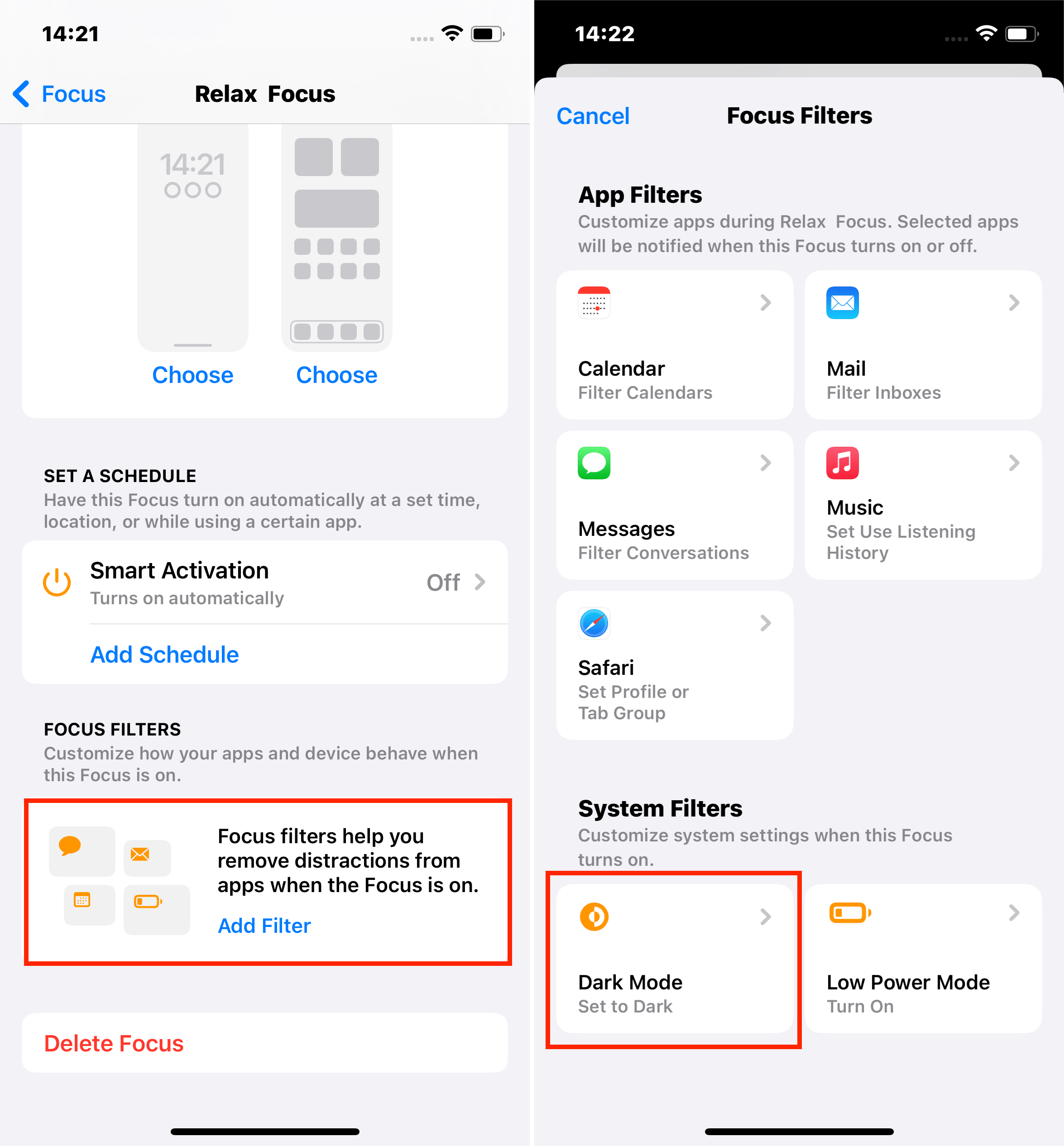 - 选择您想要启用深色模式的焦点模式。例如,放松。