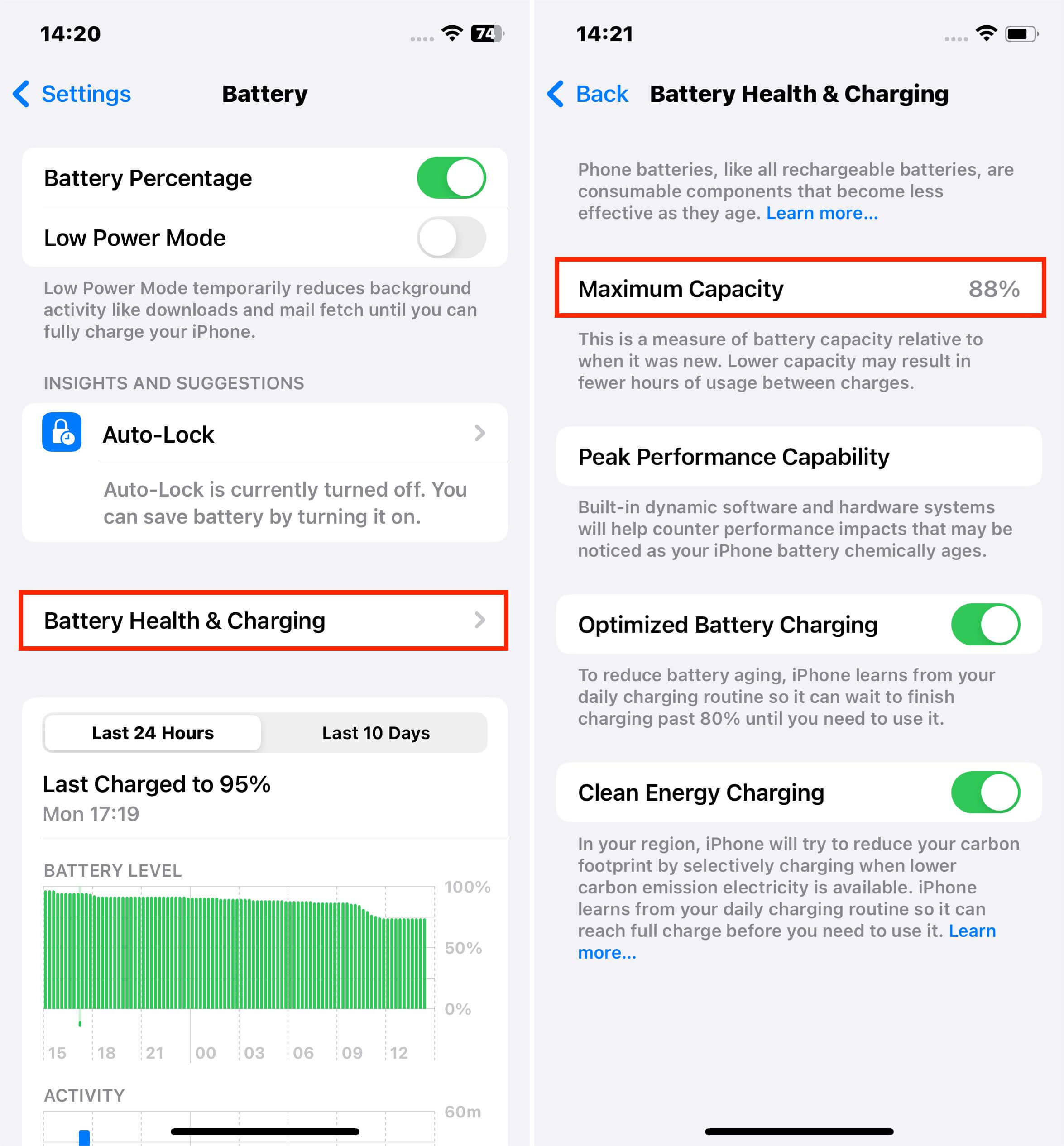 - 点击电池健康状况。查看最大容量和峰值性能能力。