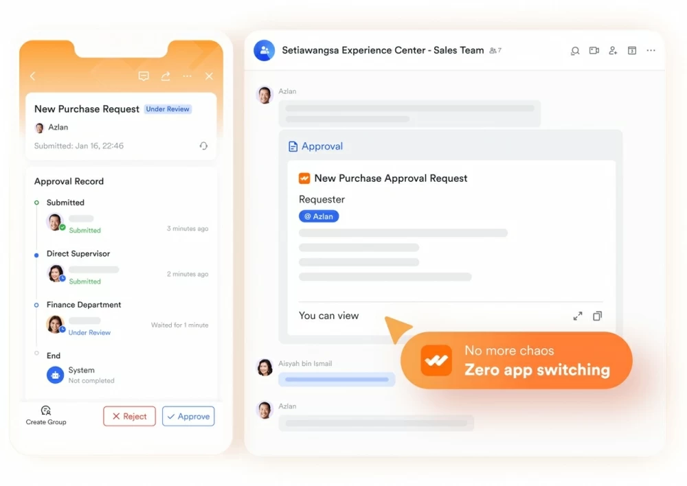您还可以设置诸如“当状态 = 已批准时,在 Messenger 中通知供应商并创建交付任务”之类的规则。交接立即发生,这保持了较高的势头。