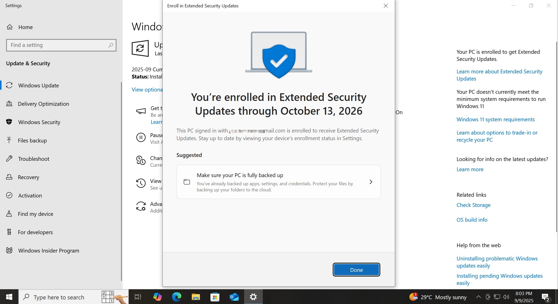 - 最后,点击完毕,并且您的电脑将有资格获得安全更新,直到 2026 年 10 月 13 日。