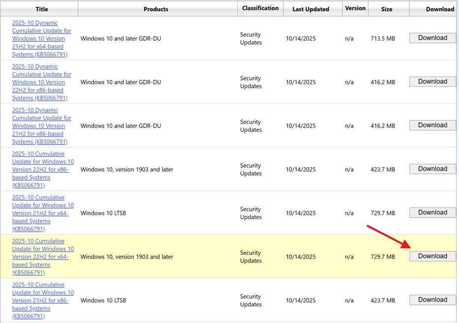 选择更新包旁边的“下载”,单击链接,它将下载 Windows 10 KB5066791 的 .msu。或者您可以前往直接链接更新目录适用于 64 位/22H2 版本。 SHA1:MhDSZAkb5e/7MlPQU5fE2u+6RMg=