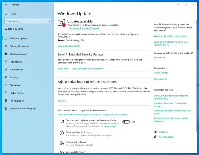 我安装了 Windows 10 KB5066791,没有明显的变化。如果您检查更新,它将显示为“适用于基于 x64 的系统的 Windows 10 版本 22H2 2025 年 10 累积更新 (KB5066791)”。微软并没有警告说这是最后一次更新,但它确实显示了注册扩展安全更新的小提示。
