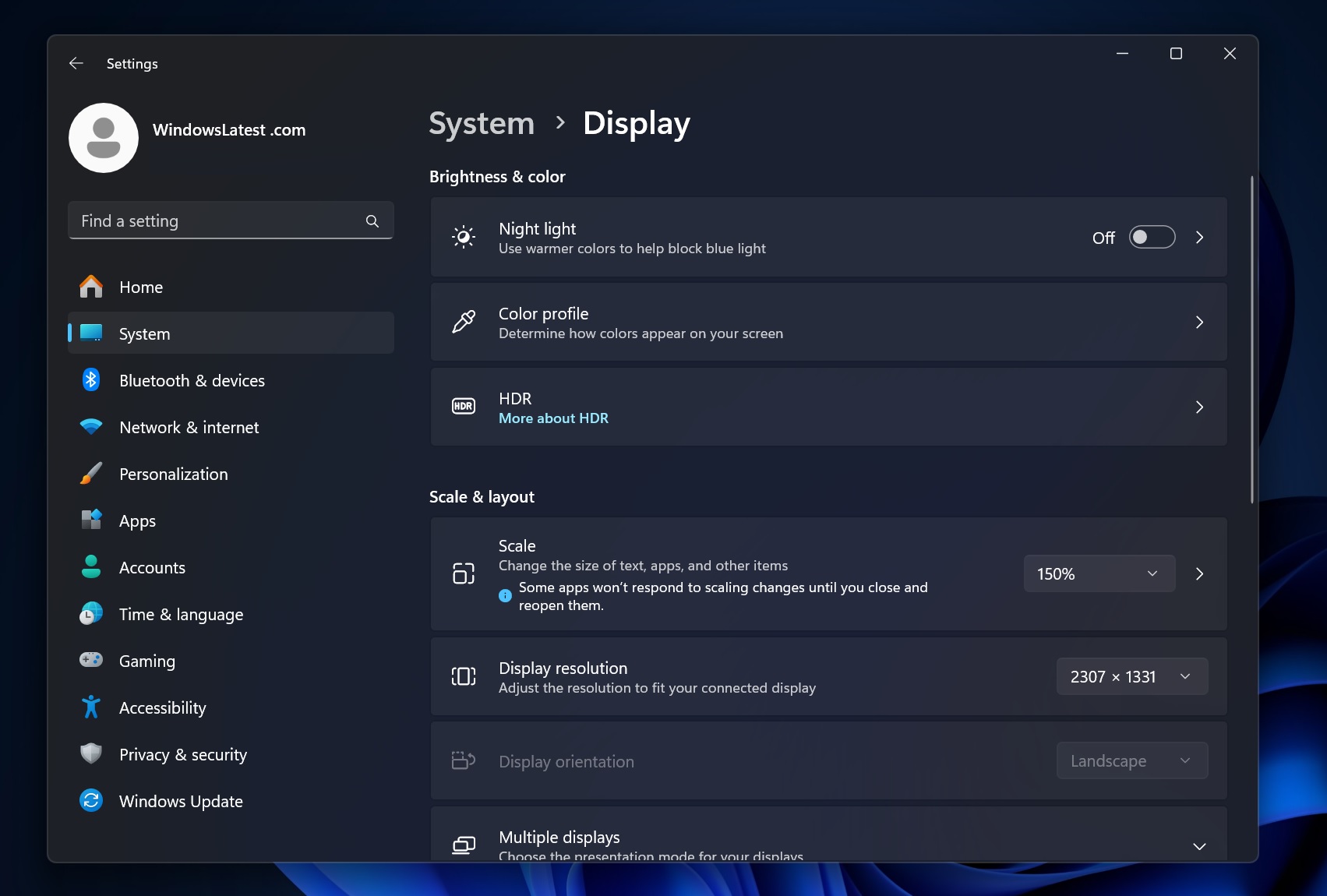 在下一个测试中,我将缩放设置从 100% 增加到 150%,并查看“开始”菜单如何自行调整: