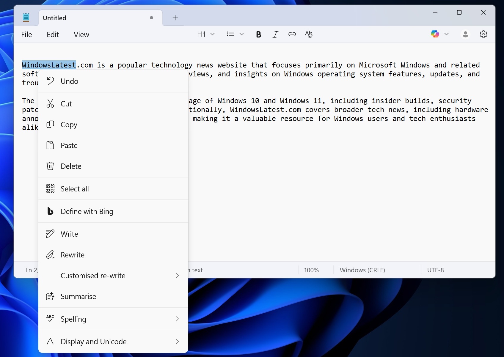虽然它感觉更干净而且我确实喜欢它,但我仍然对 AI 深度集成到 Windows 11 记事本中的方式不满意。您可以在上下文菜单中关闭 Copilot 快捷方式,但无法删除“使用 Bing 定义”等选项。或者拼写。