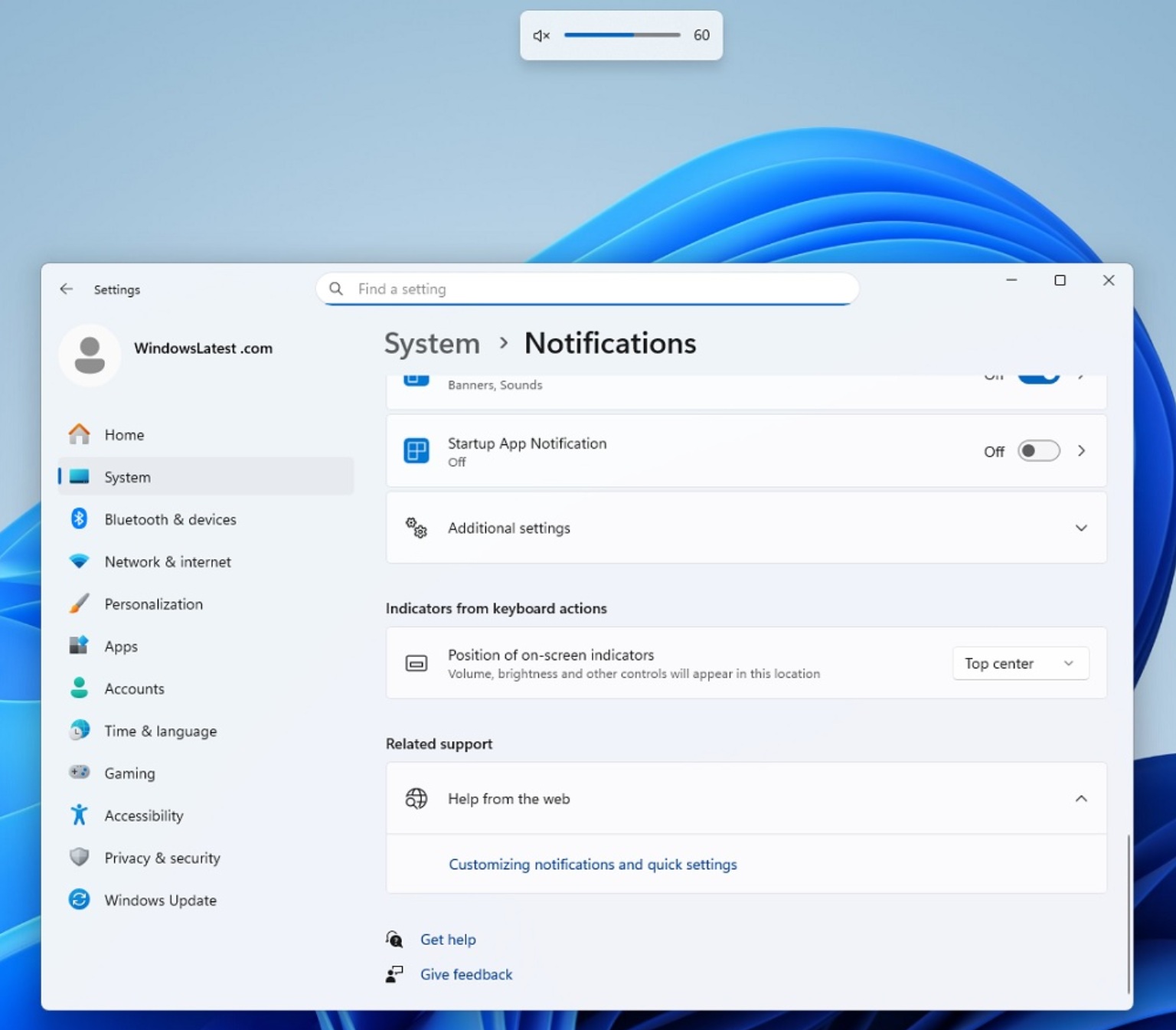 要更改调整音量或亮度时指示器的显示方式,您需要打开设置>系统>通知。