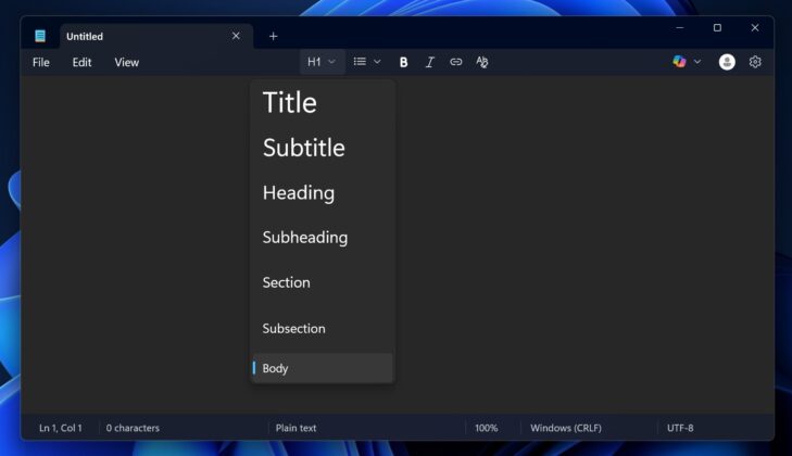 记事本现在拥有全面的 Markdown 支持,您几乎可以做任何事情。例如,正如您在下面的屏幕截图中看到的,您可以点击新的“H1”图标并选择您喜欢的标题:标题、副标题、部分甚至小节。