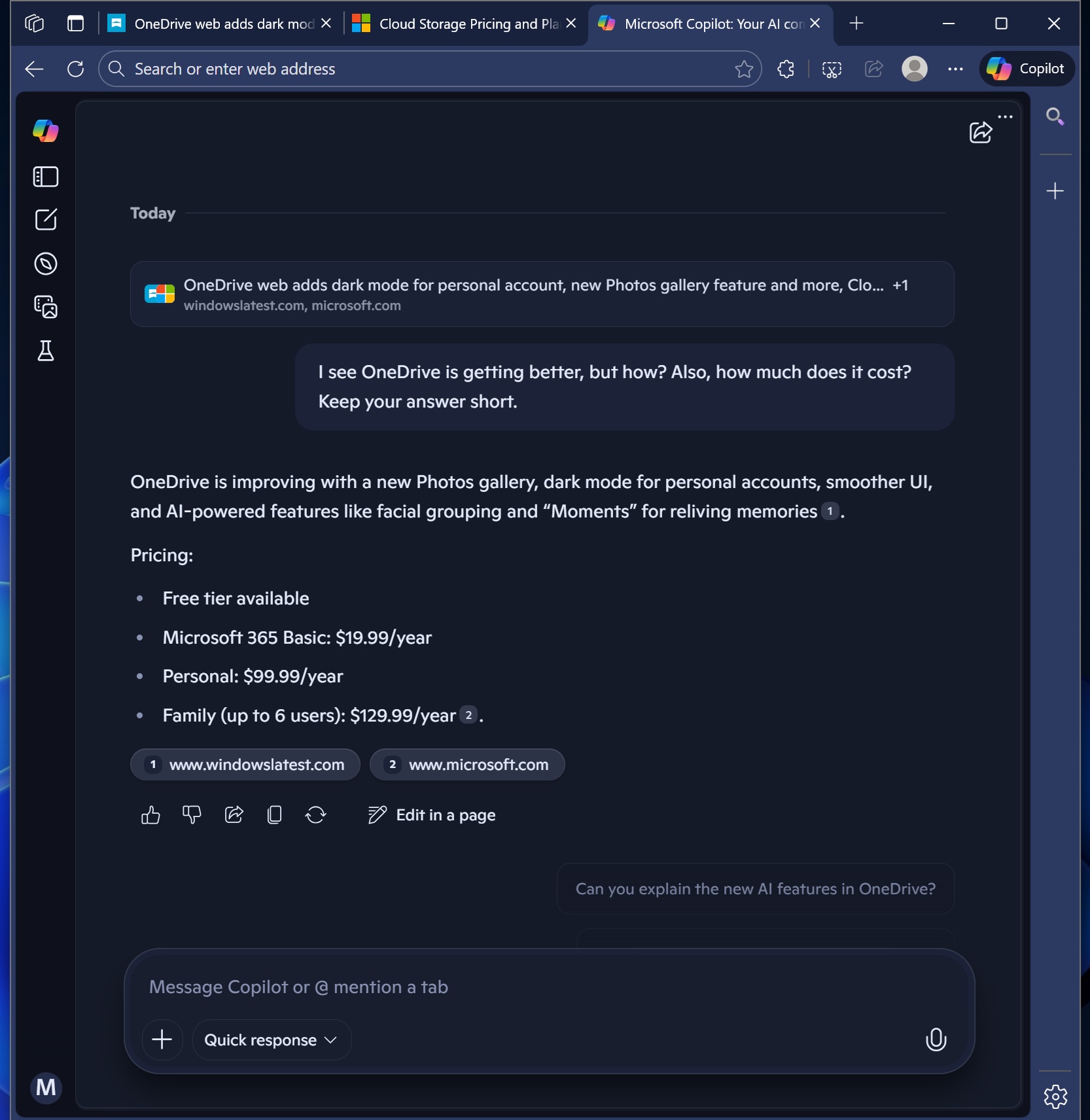 我将这两个选项卡添加到 Copilot,然后我被重定向到 copilot.microsoft.com。但有趣的是,Copilot 已经将我的选项卡添加到对话中作为上下文。我询问 Copilot OneDrive 网络如何变得更好,以及它的费用是多少。参考了两个选项卡,Copilot 迅速抬起头来,它非常准确地回答了我。