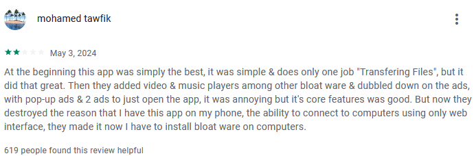 - 一开始,这个应用程序简直是最好的;它很简单,只做一项工作,“传输文件”,但它做得很好。然后他们添加了视频和音乐播放器以及其他臃肿软件,并加倍投放广告,包括弹出广告和 2 个广告来打开应用程序,这很烦人,但其核心功能很好。但现在他们毁了我在手机上安装这个应用程序的原因,即仅使用网络界面连接到计算机的能力;他们做到了,所以现在我必须在计算机上安装英国媒体报道软件。