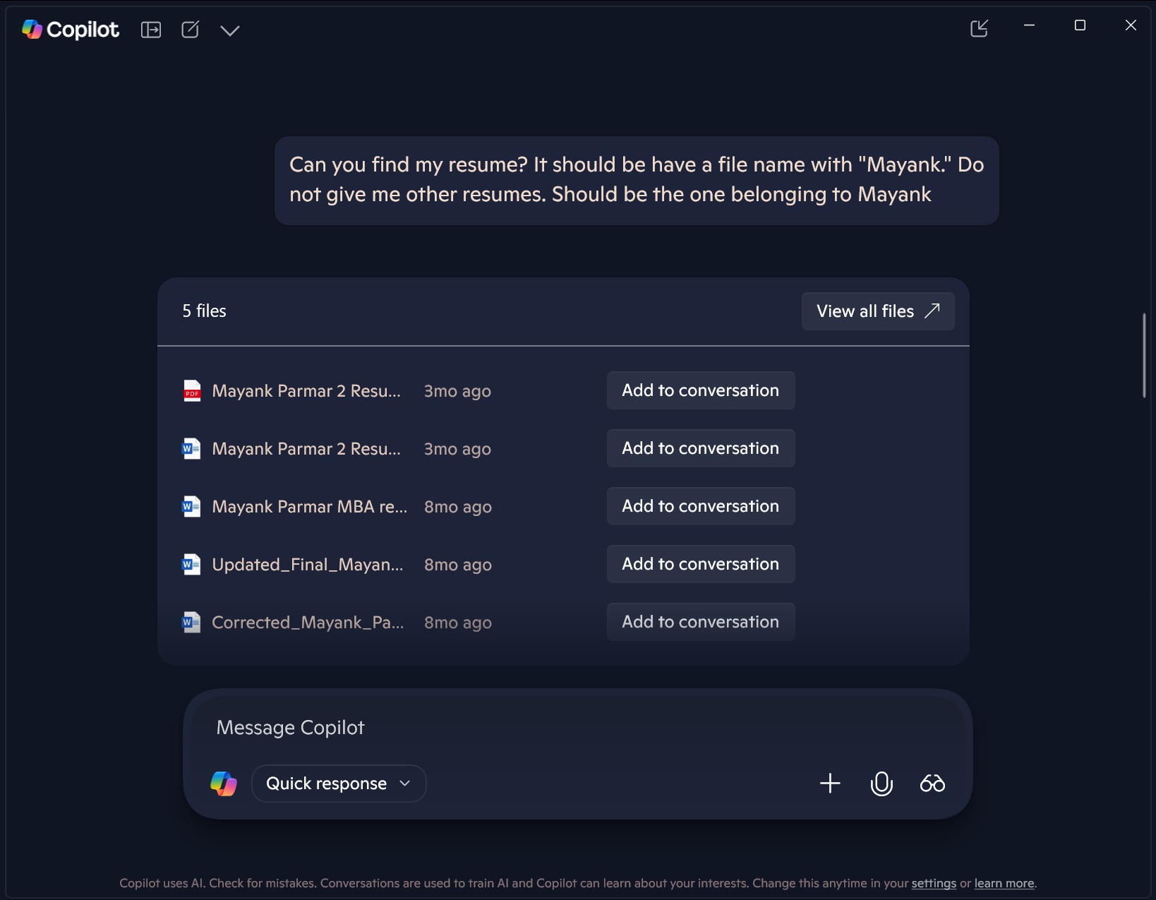 当您要求它“查找我的简历”或“显示最后几个 Excel 文件”时,它会将您的请求转换为您可能在文件资源管理器中键入的相同类型的查询。例如,当我告诉 Copilot 我需要包含我的名字“Mayank”的简历时,它会在文件资源管理器中使用查询文件名:Mayank OR 简历种类:NOT 文件夹执行搜索。