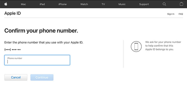 第 2 步:点击“继续”,然后输入与您的 Apple ID 关联的电话号码。