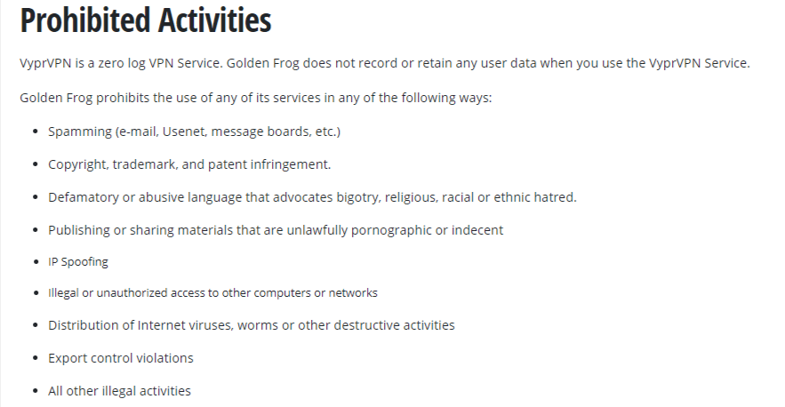 然而,根据其服务条款,VyprVPN 禁止各种活动,例如大规模垃圾邮件、IP 欺骗、版权/商标/专利侵权等。如果您被发现有此类行为,VPN 提供商甚至可能会终止您的帐户。
