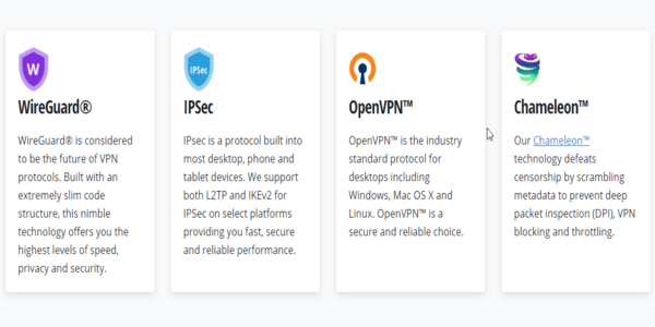 VyprVPN 支持多种协议,包括 OpenVPN 标准、IKEv2、L2TP/IPsec 和 WireGuard。此外,VPN 还提供其专有协议 Chameleon。除了具有 OpenVPN 的安全性之外,该协议还将加密您的元数据,以避免 VPN 提供商的阻止、速度限制和 DPI。这使得它成为绕过中国、沙特阿拉伯和伊朗(仅举几例)等高度审查地区的限制的绝佳选择。