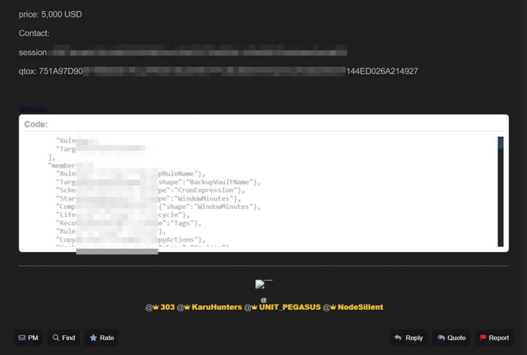 303演员爆料的平台是DarkForums一个流行的黑暗论坛。攻击者还附加了代码片段和所谓的代表 JSON 数据结构的“样本”(据称取自内部 AWS Backup API),以及对已编译 Java 文件的引用。然而,没有确凿的证据表明苹果独家内容。