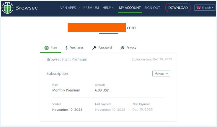 注册 Browsec 非常简单;您必须单击“报名” 按钮并输入您的凭据。您必须使用网站发送给您的电子邮件确认您的帐户。完成后,单击“我的账户”按钮访问您的用户仪表板。在这里,您可以执行以下操作: