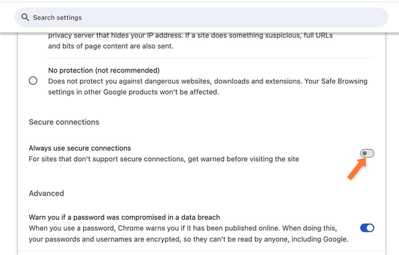 为了解决这个问题,一些广泛使用的浏览器具有“仅 HTTP”选项,阻止您在没有实际 HTTPS 保护的情况下访问网站和平台。您可以在浏览器设置的安全部分启用此功能。由于 Google Chrome 是最常用的浏览器,下面我们将解释如何在 Google Chrome 中启用它(几乎所有浏览器的步骤都是相同的):