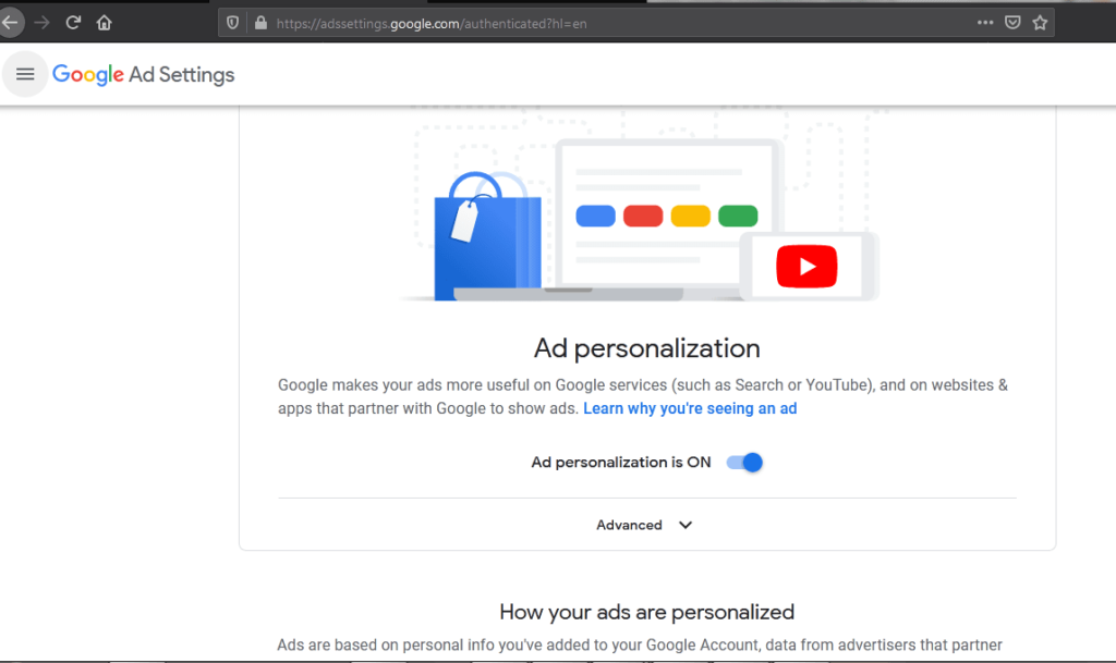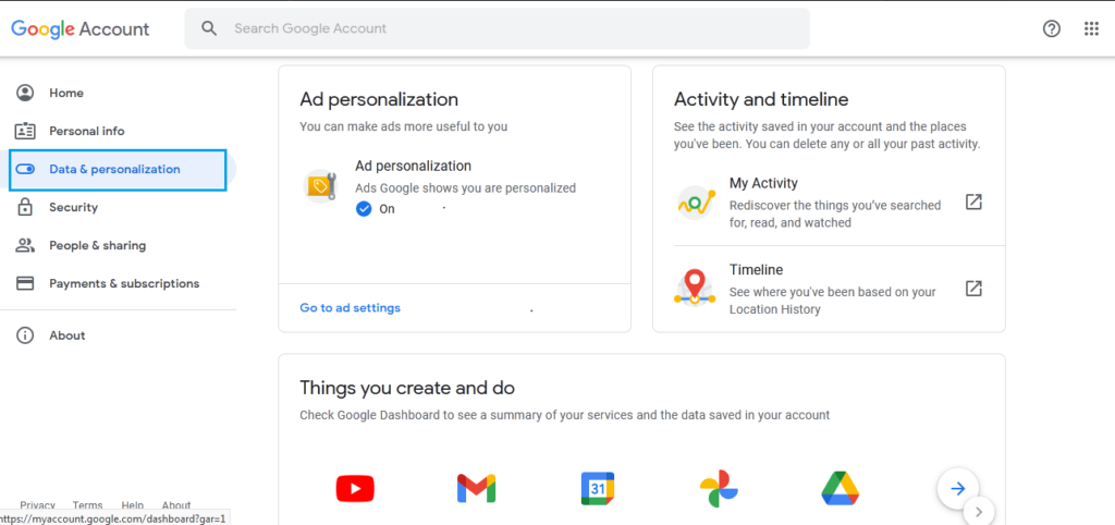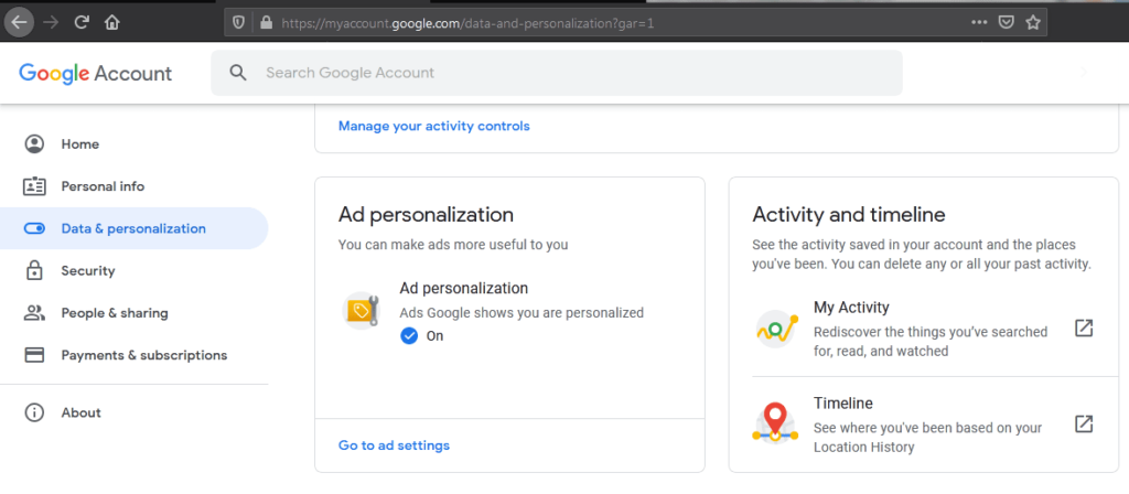 要查看此信息,请单击您的个人资料,然后单击“管理您的 Google 帐户”。在左侧的选项列表中,单击“数据和个性化”。向下滚动到“广告个性化,”如下图所示: