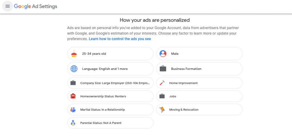 您可以关闭广告个性化,以防止 Google 根据您的活动和偏好向您展示广告。然而,这并不意味着您将不再看到广告。通过个性化,Google 根据您的性别、语言、年龄、职业、婚姻状况、房屋所有权、企业信息向您投放广告,等等。