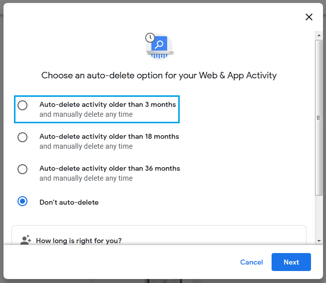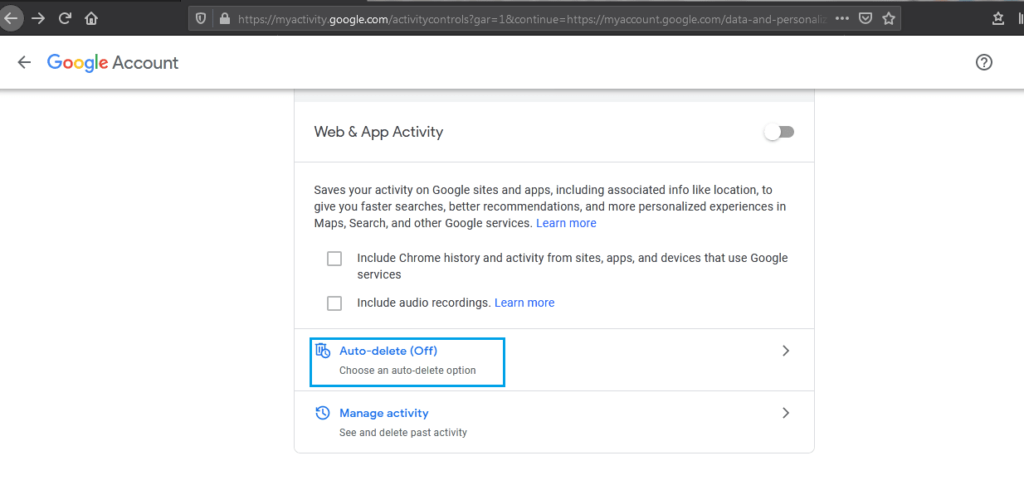 从“数据和个性化”页面,点击“管理您的活动控制”。 它带你到“活动控制”页面,您可以在其中找到“自动删除”选项。单击它,将弹出一个窗口,其中包含选项,您可以: